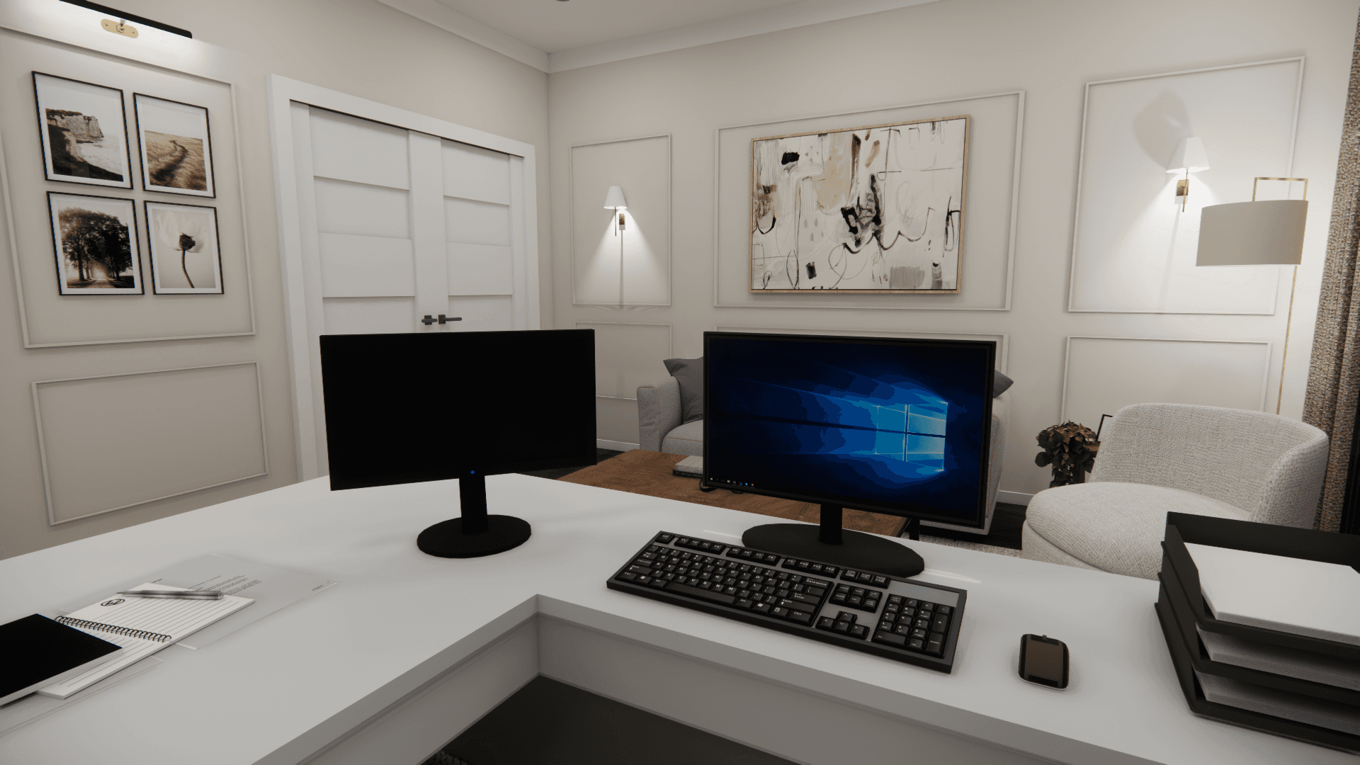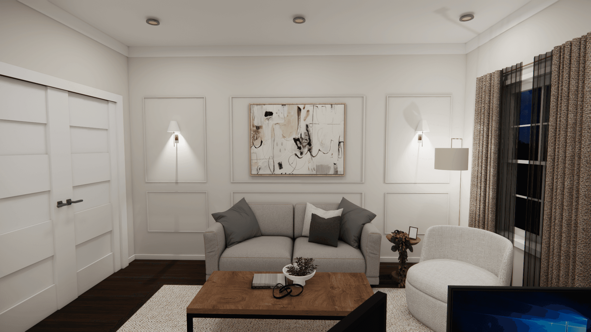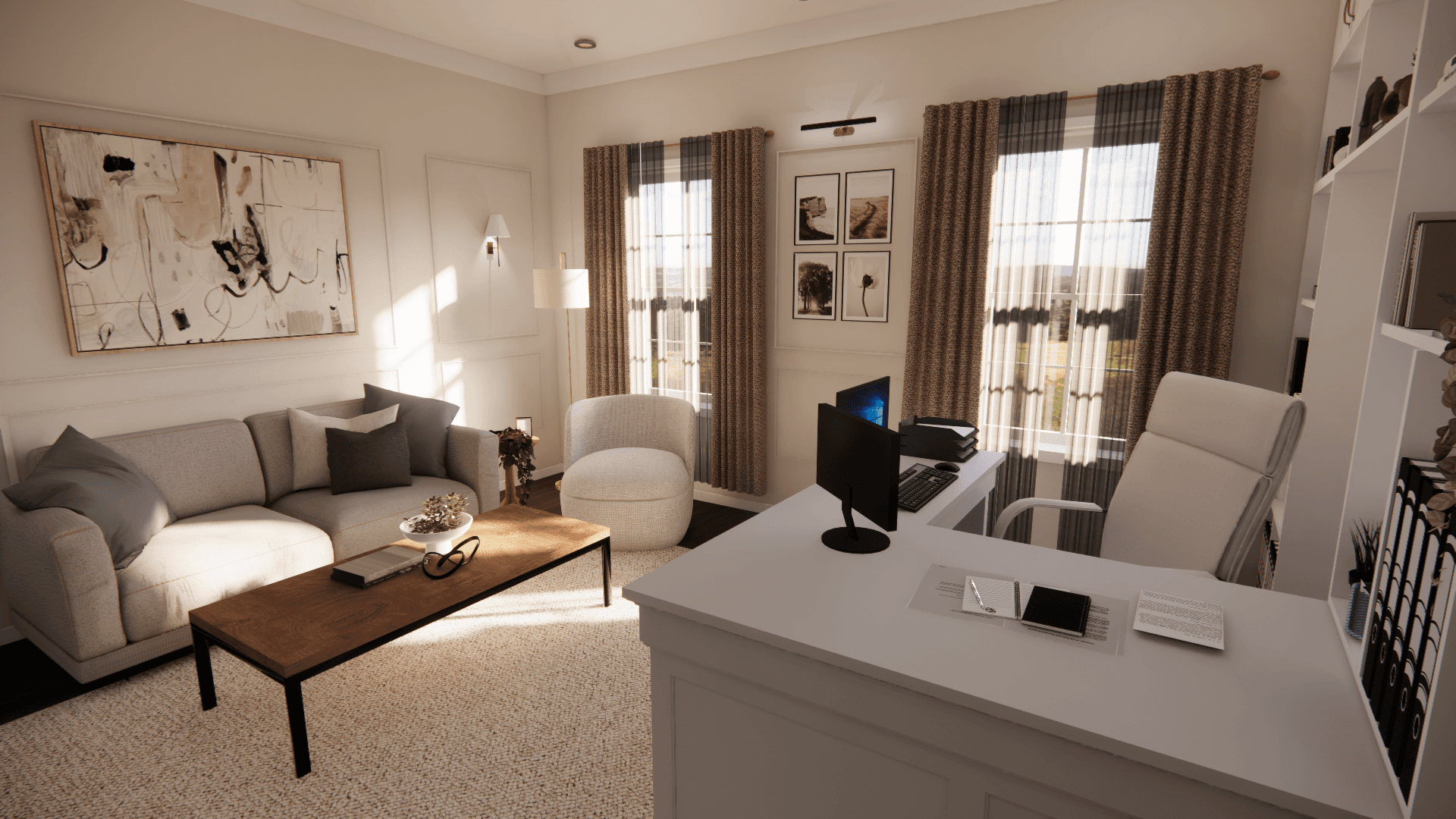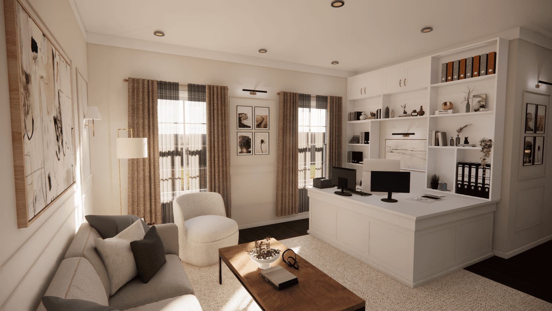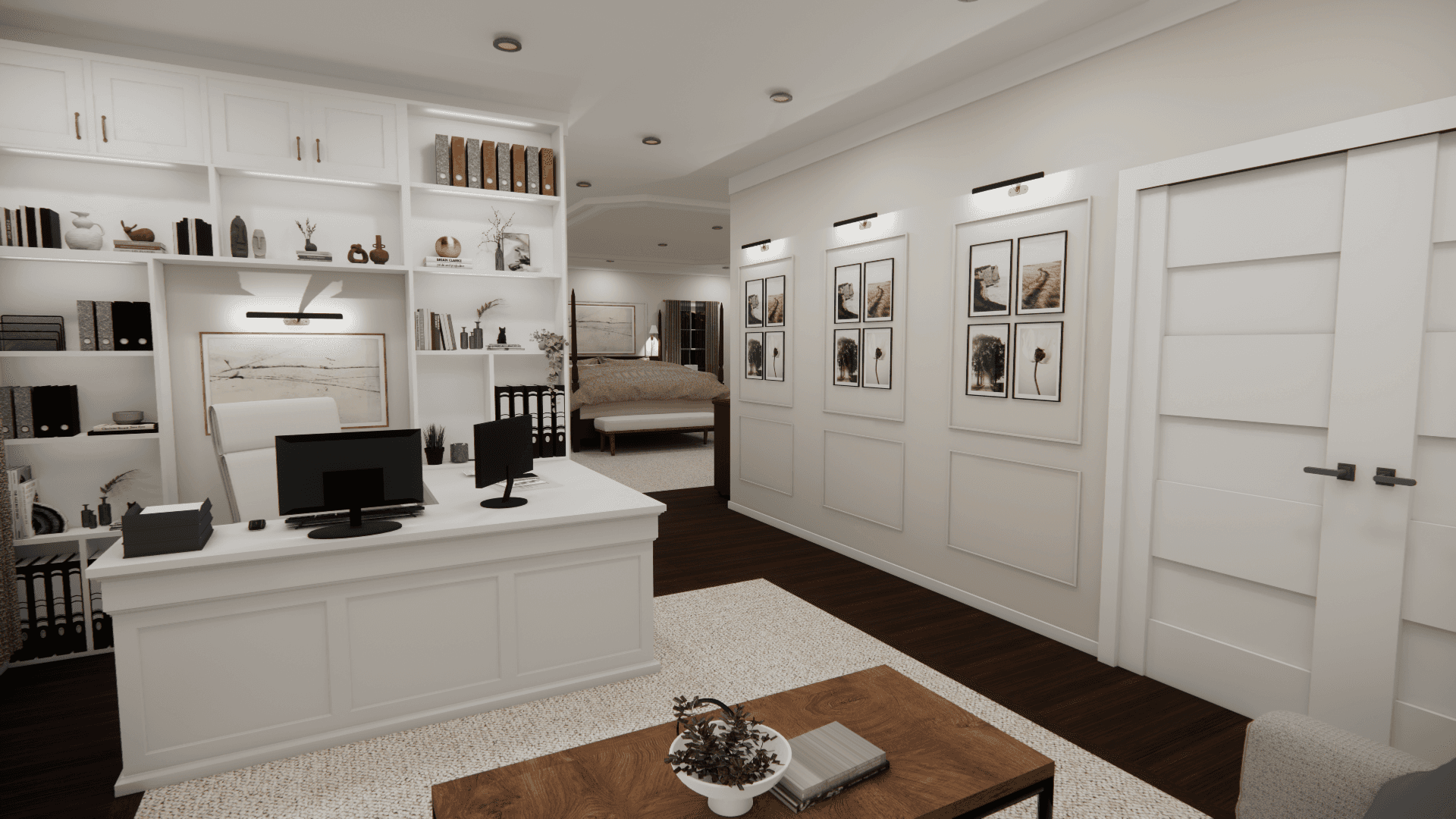 The goal for this conceptual redesign was to transform this couple’s masters bedroom and office area. I was tasked with blending both rooms into a functional and cohesive space. The couple requested a solution for lack of storage and lighting.The couple also requested that both the bedroom space and office area are defined each in their own ways.