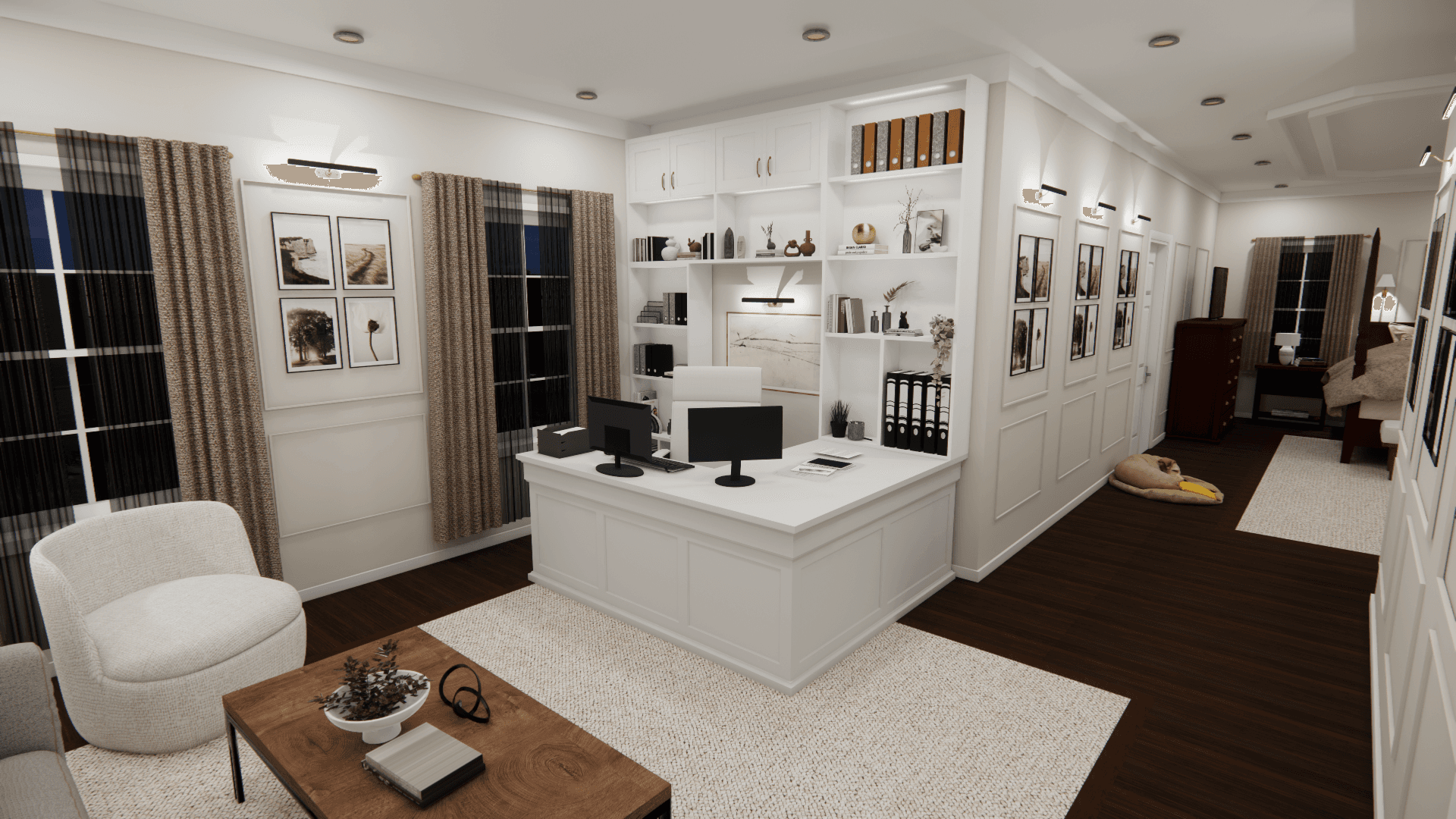 I redefined the office area with a designated small lounge/living space, as the couple requested more seating. By introducing custom storage built-ins and incorporating ambient light, I addressed the functional deficiencies and lack of task lighting. The result is a master suite that honors the distinct character of each area while maintaining a unified experience.